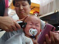 Everybody had a hair cut today. It started with Mama in the morning. Then we (I, Papa, and Akung) also got a hair cut. Guess whose hair got cut the most? Hik...hik...hik...